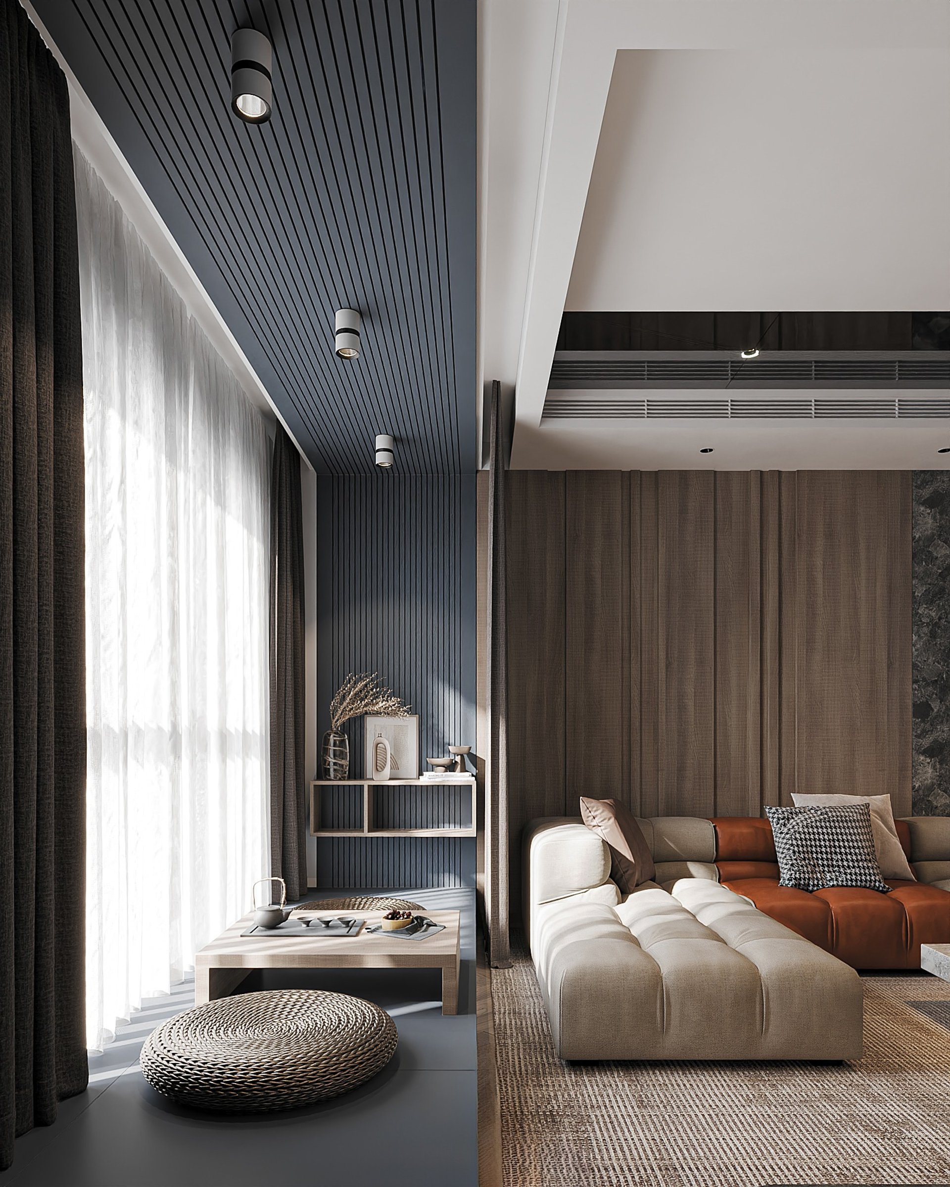 Khu vực thư giãn: Một góc nhỏ được tạo ra với sàn và trần ốp gỗ màu tối, kết hợp với rèm cửa và ánh sáng dịu nhẹ, tạo một không gian riêng tư để đọc sách hoặc thưởng thức trà.