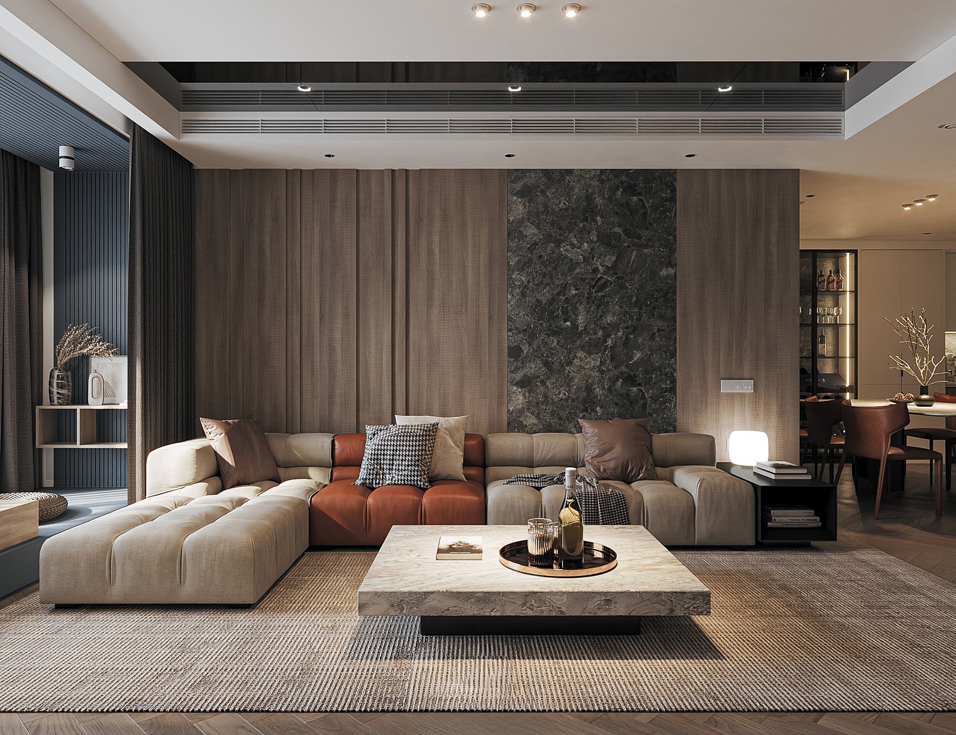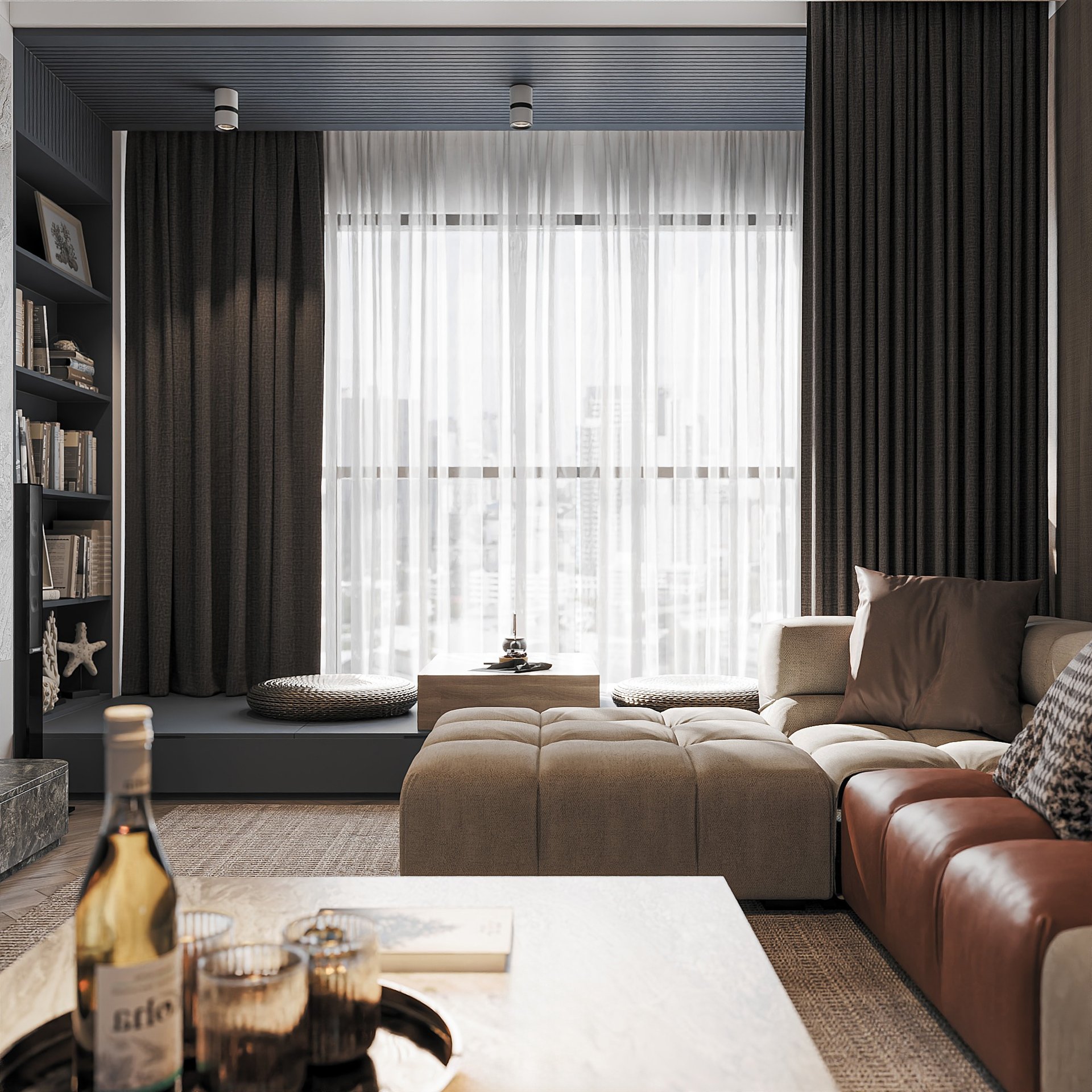 Nội thất sofa: Bộ sofa chữ L với tông màu nâu và be kết hợp, mang lại cảm giác ấm áp và thoải mái. Rèm cửa hai lớp giúp dễ dàng điều chỉnh ánh sáng, tạo ra các hiệu ứng khác nhau cho không gian.