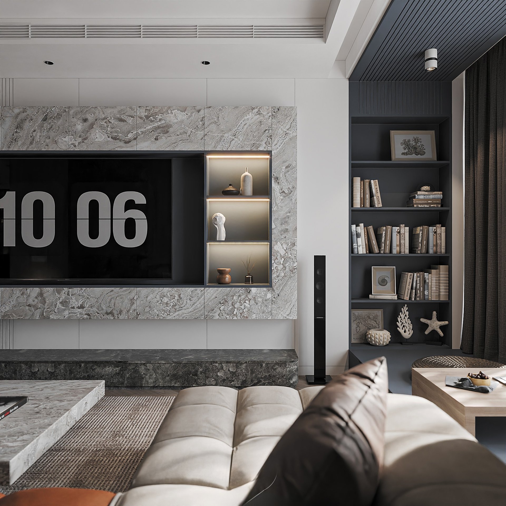 Mảng tường ấn tượng: Bức tường tivi được ốp đá cẩm thạch trắng vân xám tinh tế, kết hợp với một mảng ốp kim loại màu đồng, tạo điểm nhấn nổi bật cho căn phòng. Kệ tivi bằng đá nguyên khối tạo nên một tổng thể vững chãi và sang trọng.