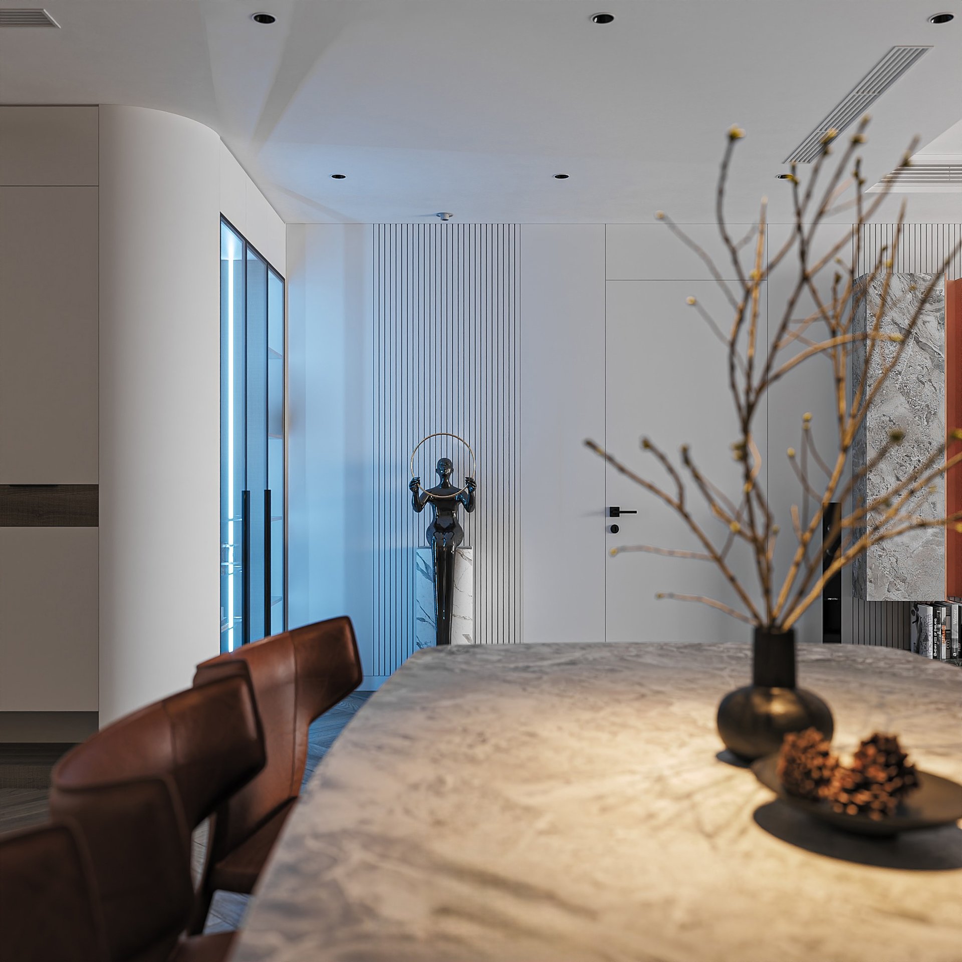 Điểm nhấn trang trí: Một tác phẩm điêu khắc nghệ thuật màu đen được đặt trên bệ đá cẩm thạch gần bàn ăn, thu hút mọi ánh nhìn và thể hiện gu thẩm mỹ độc đáo của gia chủ.