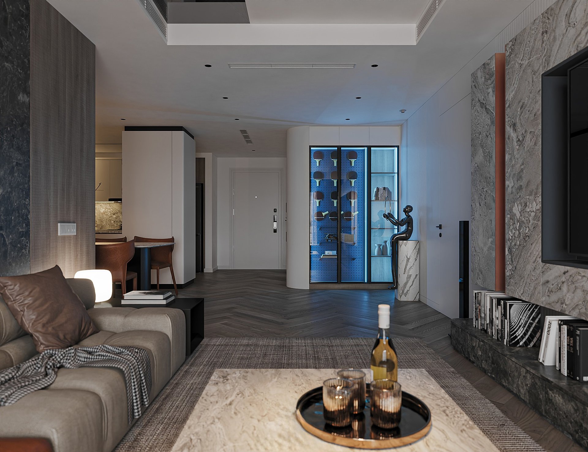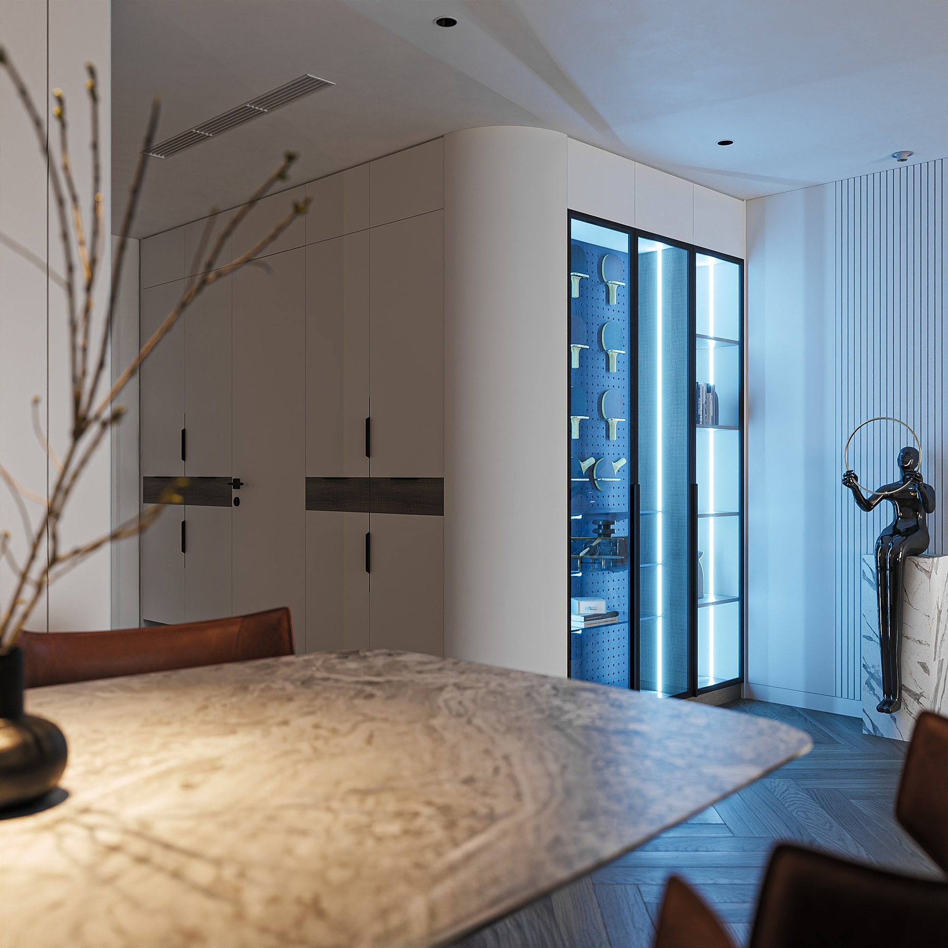 Hệ tủ kệ: Tủ kệ trưng bày ở khu vực ra vào được thiết kế với đèn LED màu xanh, làm nổi bật các món đồ trang trí, tạo điểm nhấn hiện đại và phá cách.