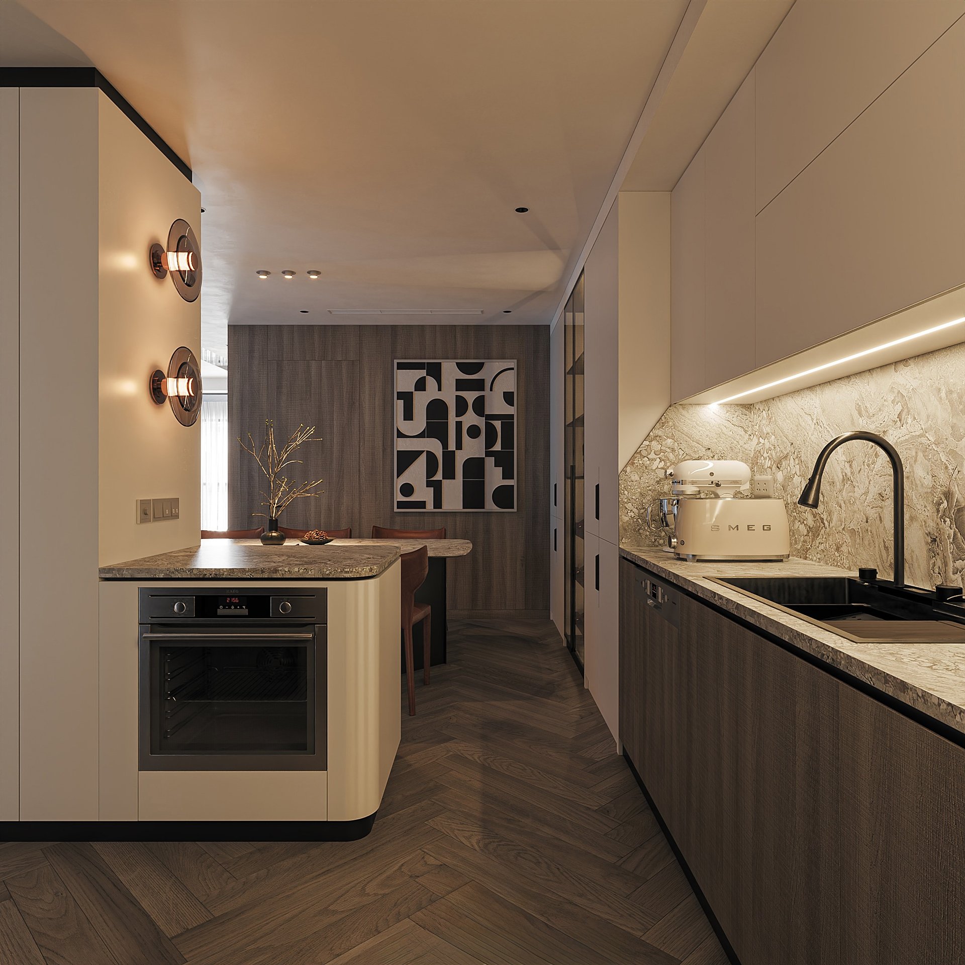 Bếp: Khu vực bếp được thiết kế theo phong cách tối giản và hiện đại. Bàn đảo bếp với mặt đá vân mây kết hợp với tủ bếp gỗ màu nâu ấm. Thiết bị nhà bếp được tích hợp gọn gàng, tạo không gian nấu nướng tiện nghi.