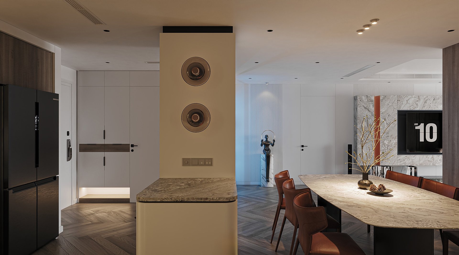 Bàn ăn: Bàn ăn có mặt đá vân, kết hợp với ghế ăn bọc da màu nâu, tạo sự đồng bộ với màu sắc tổng thể của căn hộ.