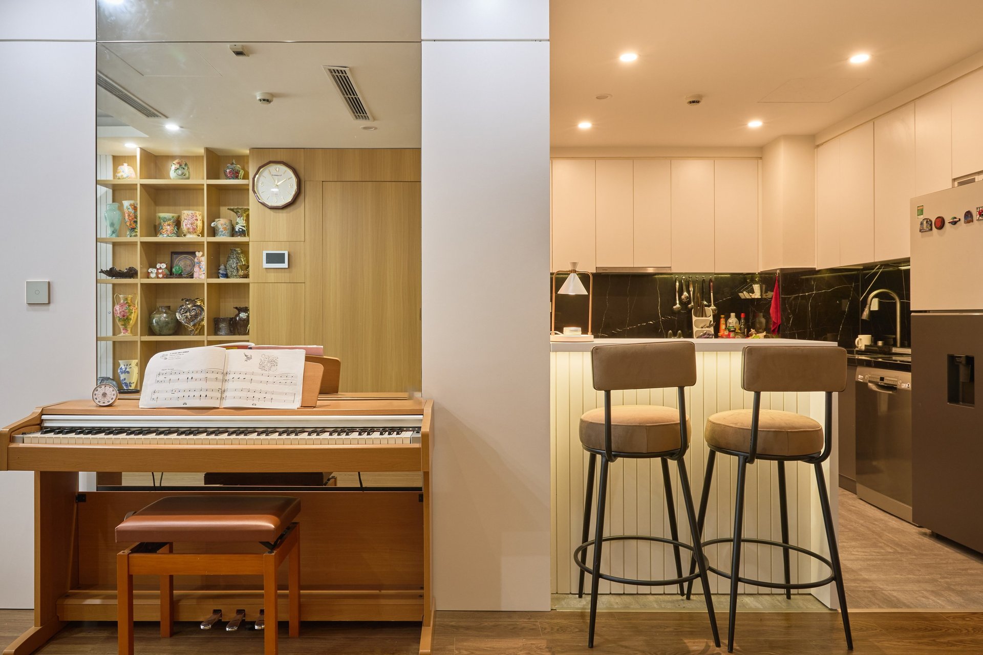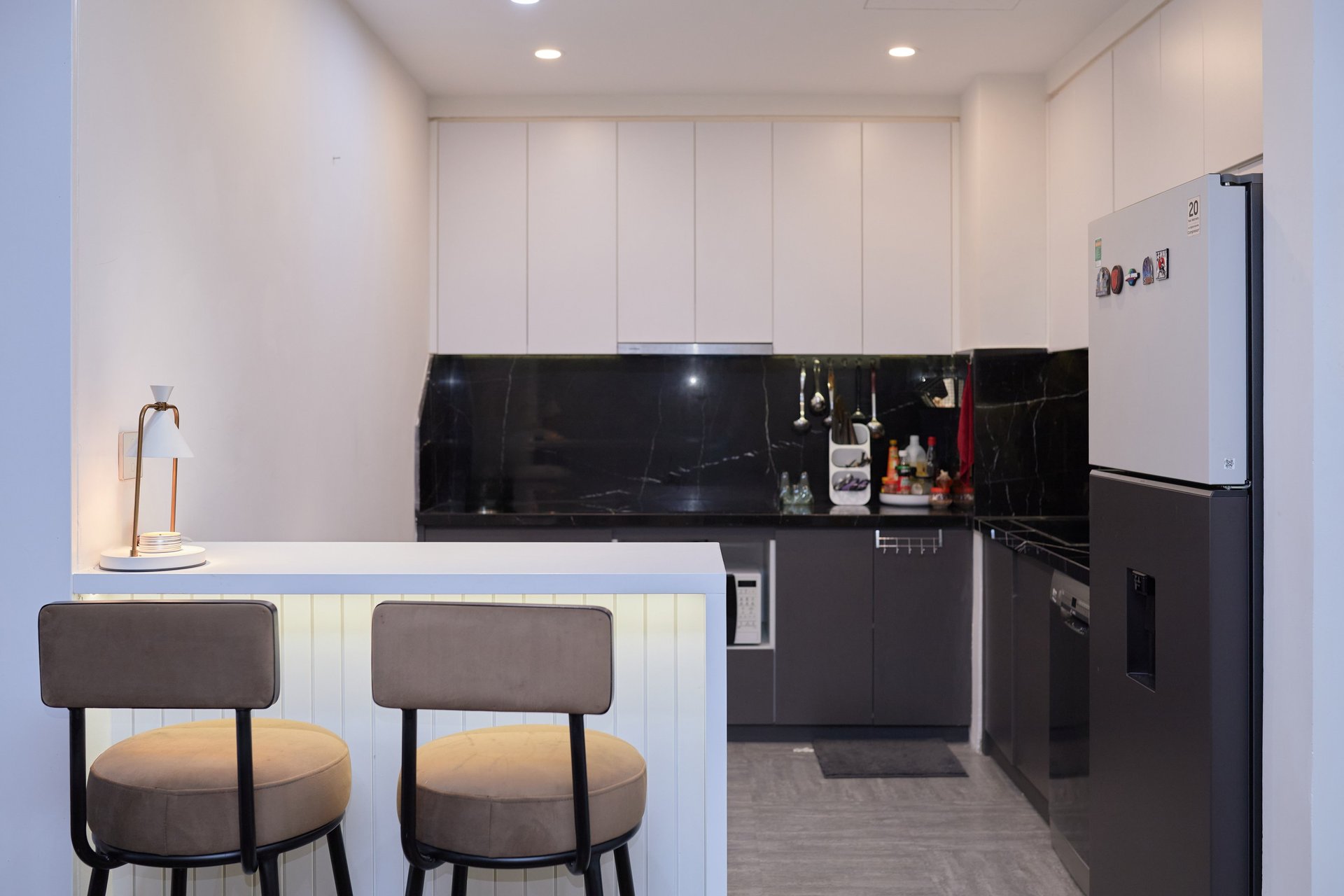 Quầy bar: Một quầy bar nhỏ được bố trí nối liền với bếp, kèm theo hai chiếc ghế bar, tạo thành một khu vực ăn uống nhanh hoặc thư giãn lý tưởng.