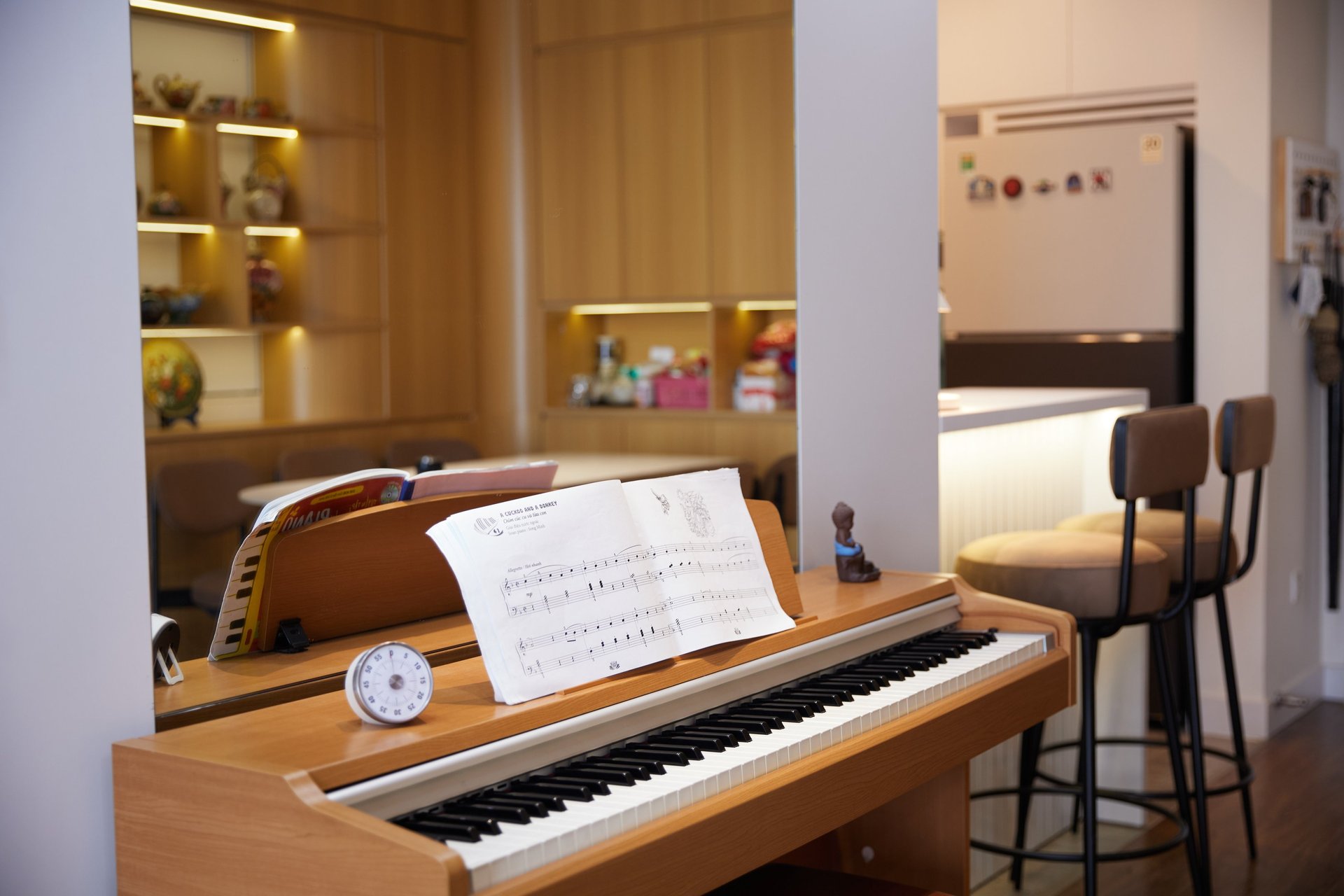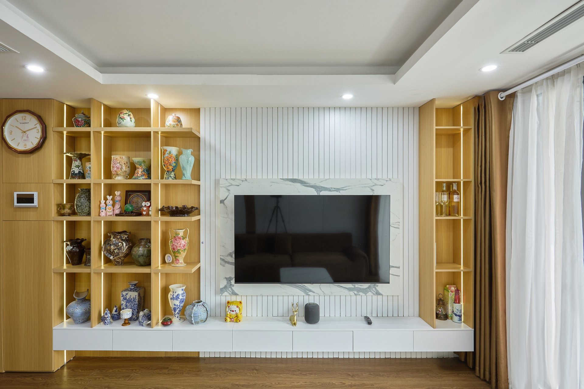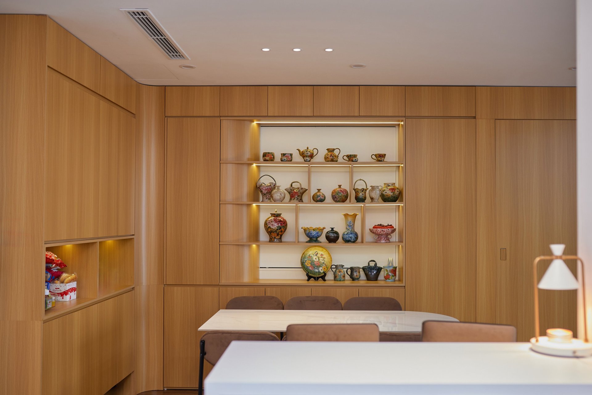 Kệ tủ đa năng: Điểm nhấn ấn tượng nhất là hệ tủ kệ lớn đa năng. Kệ được chia thành nhiều ô vuông nhỏ, vừa là nơi trưng bày những món đồ gốm sứ tinh xảo, vừa là không gian lưu trữ tiện lợi. Ánh sáng vàng dịu nhẹ từ đèn LED âm trần làm nổi bật các món đồ trang trí, tạo nên một "bức tường" nghệ thuật cho căn phòng.