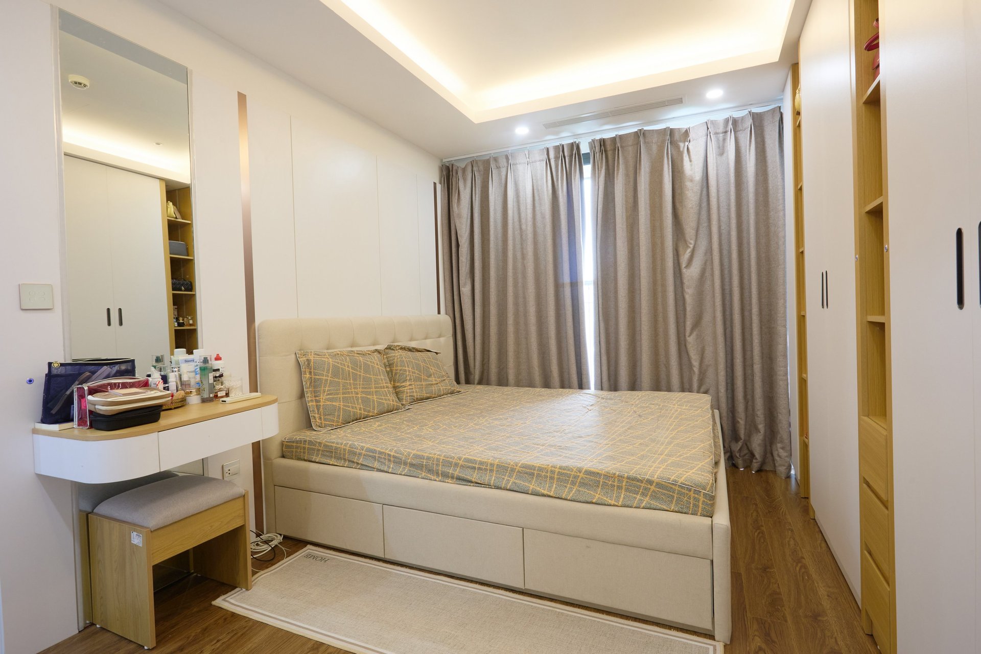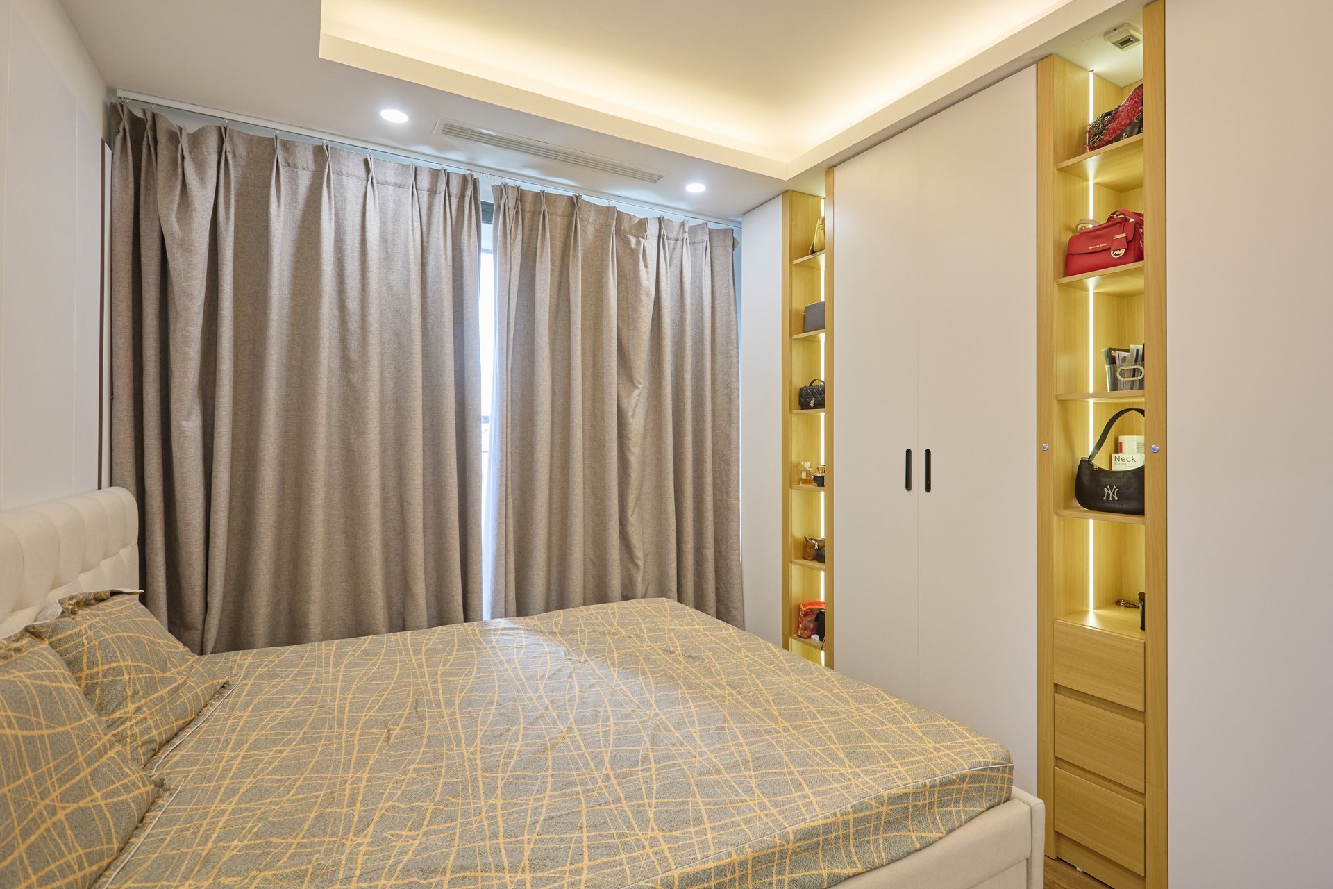 Giường và tủ: Giường ngủ với tông màu be, kết hợp với chăn ga gối màu vàng nhạt, tạo cảm giác thư thái. Tủ quần áo lớn được thiết kế âm tường màu trắng, kết hợp với các kệ gỗ mở có đèn, vừa là nơi lưu trữ, vừa là nơi trưng bày túi xách hoặc các phụ kiện, rất tiện lợi và thẩm mỹ.