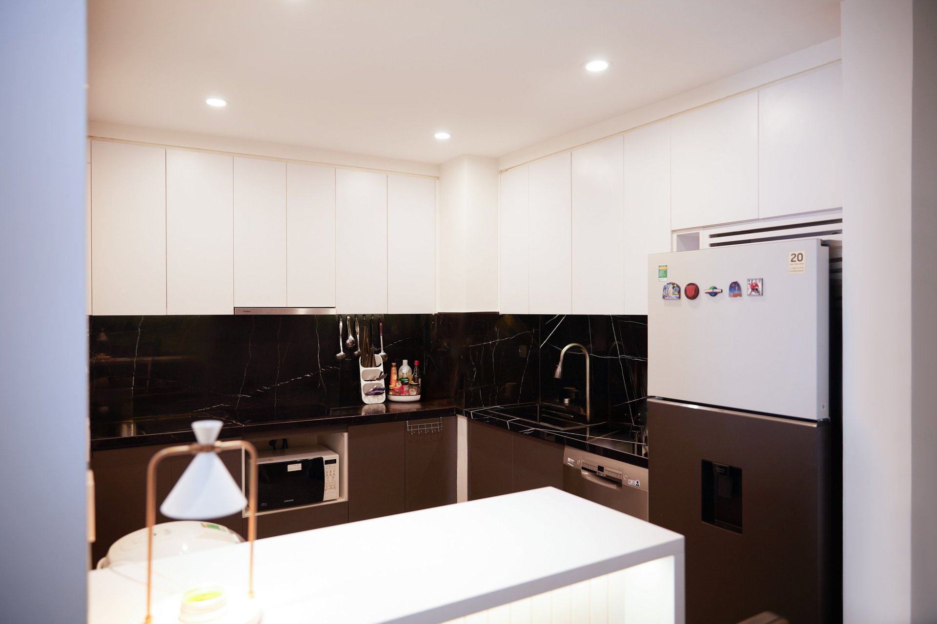 Tủ bếp: Hệ tủ bếp trên màu trắng và tủ bếp dưới màu xám được bố trí gọn gàng.
